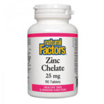 Цинковият хелат на Natural Factors съдържа 25 мг от този важен микроелемент. Цинкът подпомага естествените защити на нашето тяло и е важен за здравата кожа. Той е необходим за много хормони и помага за здравата репродуктивна система включително и за доброто здраве на простатата. Цинкът е необходим на сетивата ни за мирис, вкус и зрение. За по-лесна абсорбция хидролизираните протеини в цинковия хелат са извлечени от ориз.
