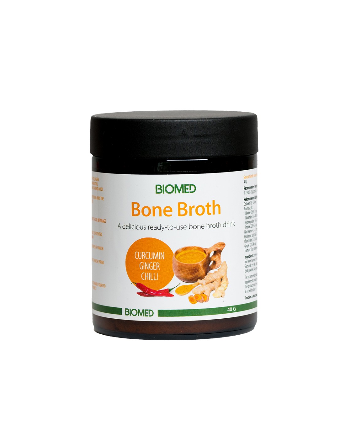 Bone broth powder – curcumin + ginger + chili – Костен бульон от финландски северен елен + куркумин + джинджифил + чили е хранителна добавка под формата на прах, която съдържа в състава си дехидратиран екстракт от костен бульон на северен елен в комбинация с микс от растителни екстракти в подкрепа нормалното състояние на ставите, костите и опорно-двигателния апарат