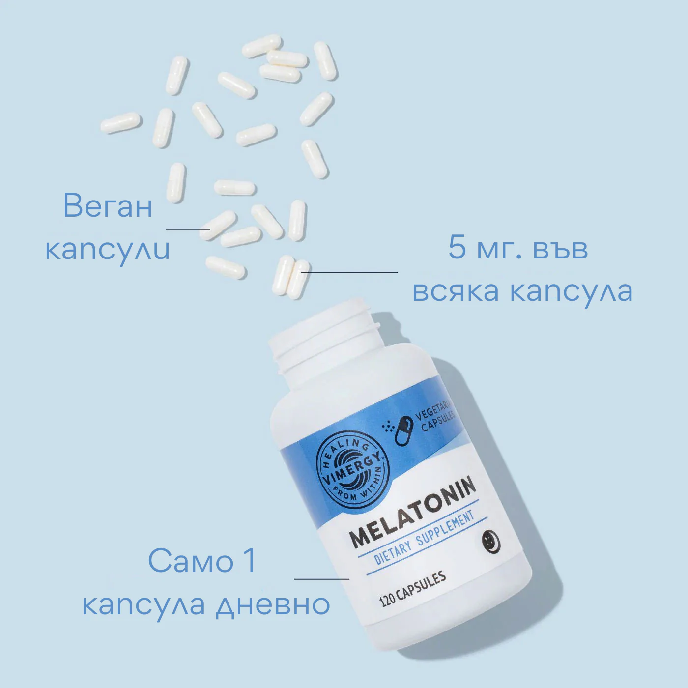 Ако имате проблеми със съня и ви е трудно да заспивате, будите се често и не се наспивате, за облекчаване на тези проблеми, вашият помощник е продуктът Мелатонин на Vimergy. Той съдържа 5 мг. мелатонин във всяка капсула.