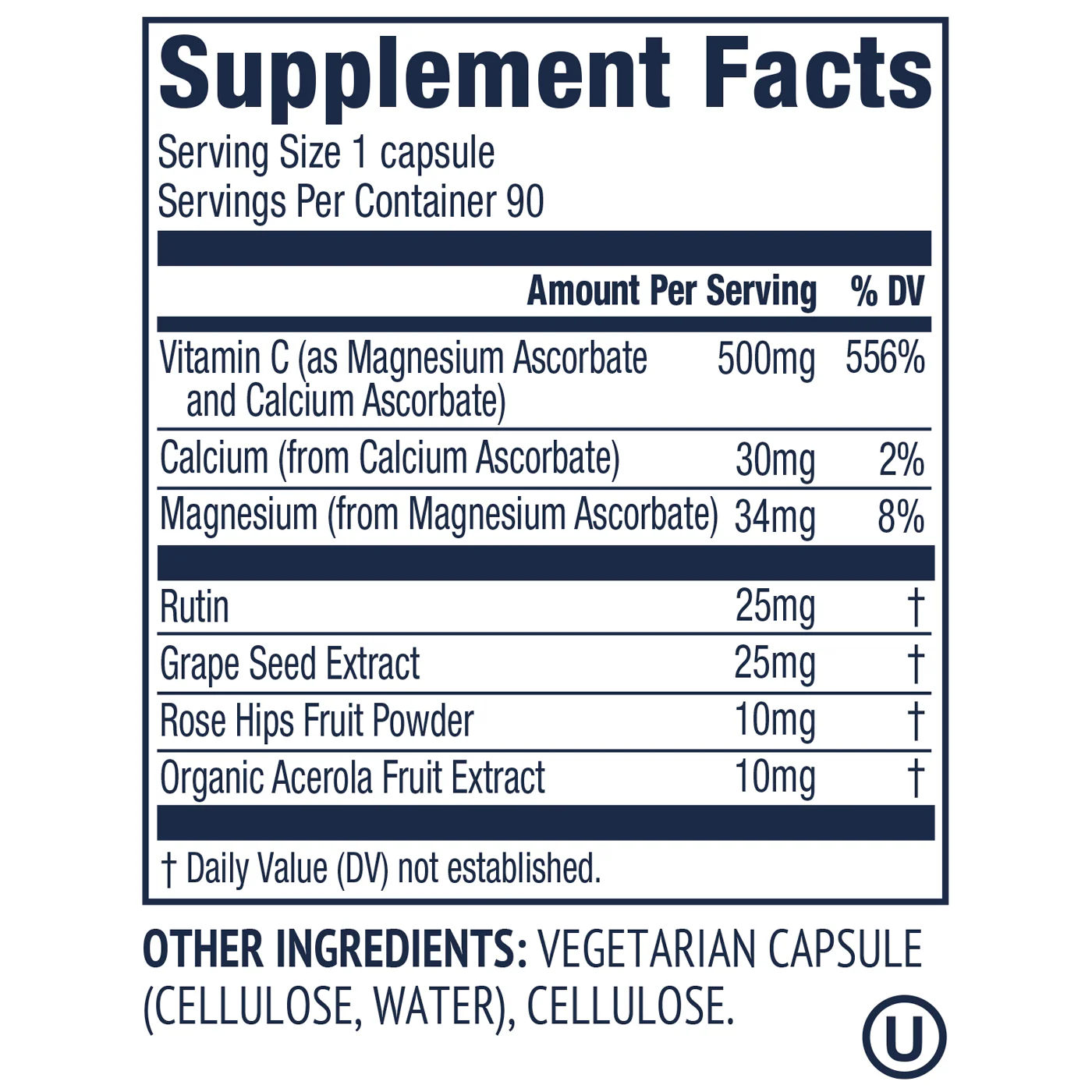Витамин Ц (като калциев / магнезиев аскорбат) , капсулна обвивка вегетарианска капсула (целулоза, вода) , пълнител, целулоза , екстракт от гроздови семки , рутин , шипки , екстракт от ацерола , антиоксидант, естер на мастни киселини на аскорбинова киселина