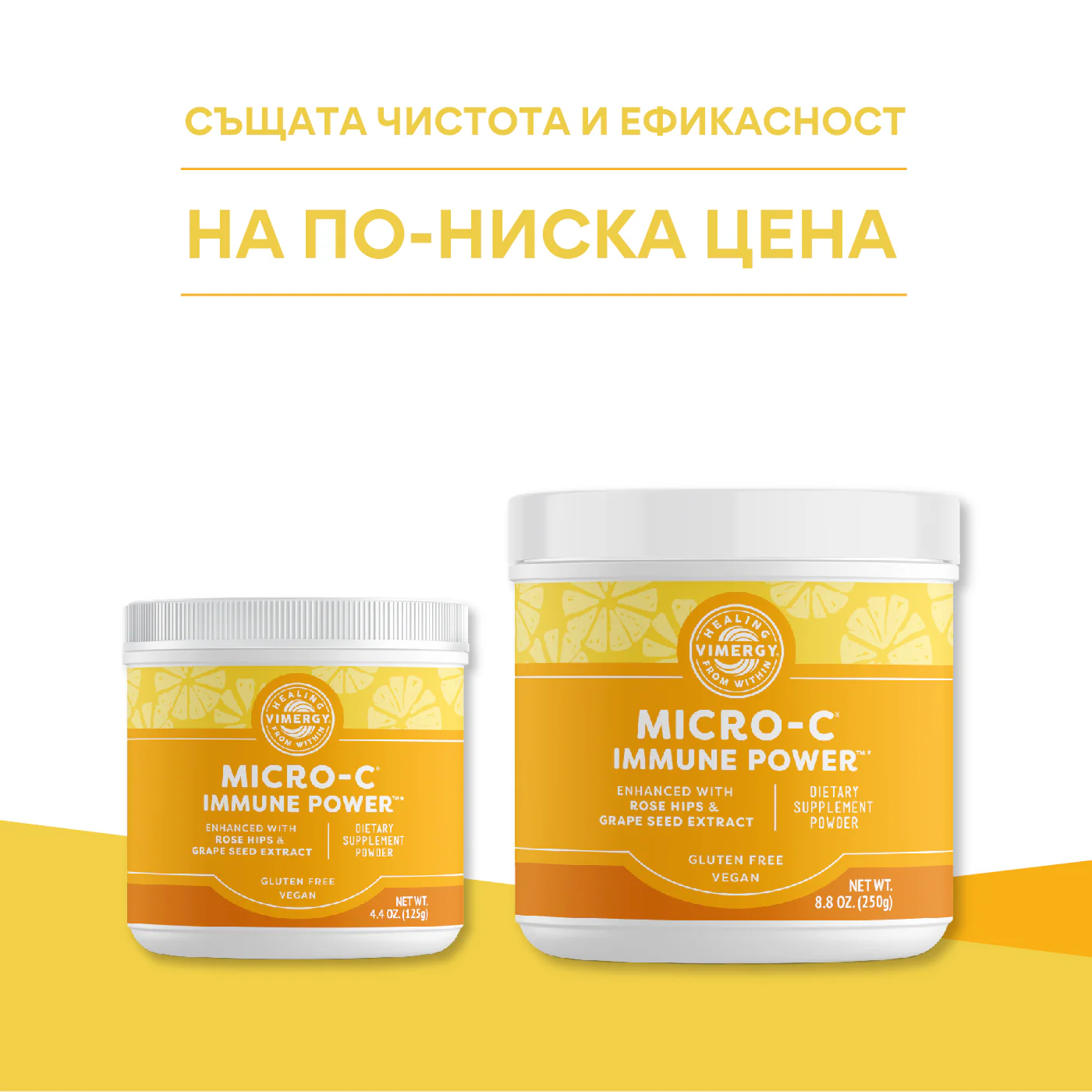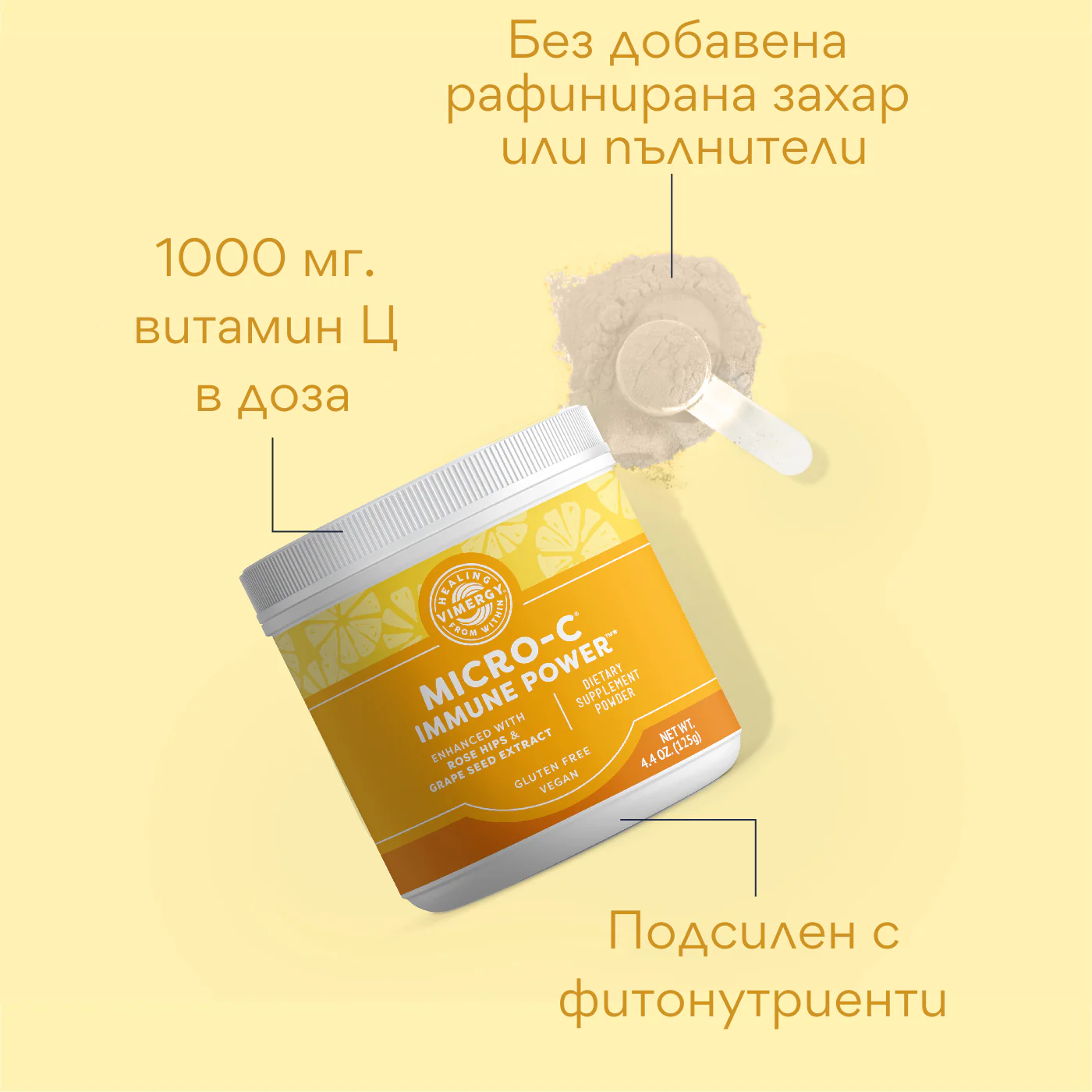 Поддържането на стабилна имунна система може да бъде предизвикателство в наши дни. Микро-Ц Immune Power™ е вашият партньор не само в изграждането на устойчив имунитет, но и на силни кости, здрави стави и много други аспекти на вашето здраве! Специална прахообразна версия на любимите ни капсули Микро-Ц, всеки препоръчителен дневен прием от новия Микро-Ц Immune Power™ съдържа 1000 мг. от същия буфериран витамин Ц – щадящ стомаха, същите антиоксидантни фитонутриенти – шипка и ацерола, като тук е добавен и бамбуков силициев диоксид за още по-голяма подкрепа на производството на колаген!