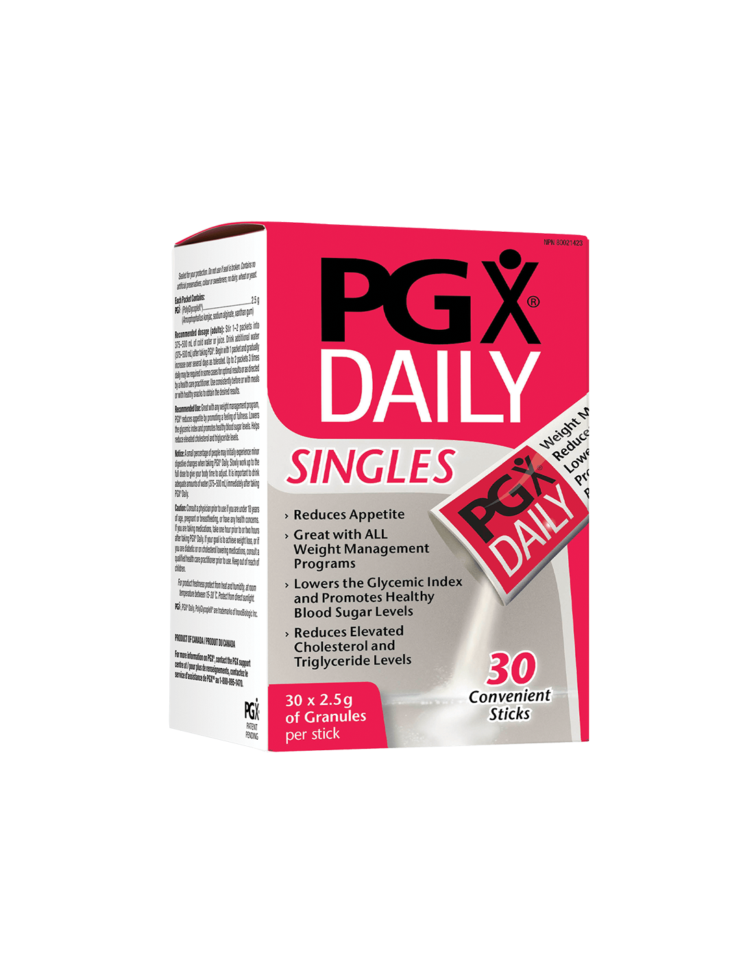 предлага естествено, безопасно и ефективно решение на проблема с излишните килограми. PGX® Daily Ultra Singles подпомага контрола върху кръвната захар, апетита и нивата на холестерола – трите основни фактора, важни за поддържане на здравословно тегло.