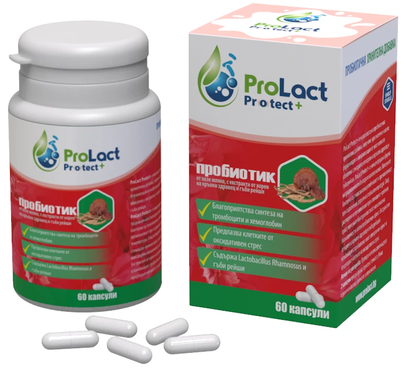ProLact Protect+ е нисколактозна пробиотична хранителна добавка, получена чрез млечно-кисела ферментация и лиофилизация от козе мляко и обогатена с екстракти от корен на кръвен здравец и гъби рейши. ПроЛакт Протект+ е концентрирана форма на традиционното българско кисело мляко. Полезните бактерии са с максимална устойчивост и преживяемост при съхранение, дори и на стайна температура. След разтваряне и преминаване през стомашно-чревния тракт, полезните бактерии постигат максимална бионаличност и силен пробиотичен ефект. Екстрактите от корен на кръвен здравец и гъби рейши в комбинация с пробиотика имат синергичен ефект и предпазват клетките от оксидативен стрес.