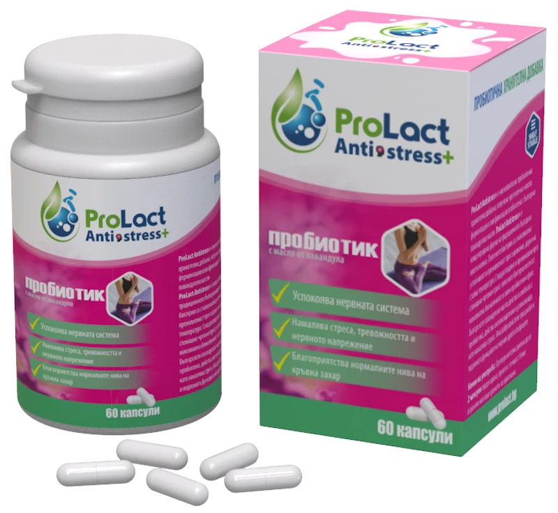 ProLact Antistress+ е нисколактозна пробиотична хранителна добавка, получена чрез млечно-кисела ферментация и лиофилизация и обогатена с българско лавандулово масло. ПроЛакт Антистрес+ е концентрирана форма на традиционното българско кисело мляко. Полезните бактерии са с максимална устойчивост и преживяемост при съхранение, дори и на стайна температура. След разтваряне и преминаване през стомашно-чревния тракт, полезните бактерии постигат максимална бионаличност и силен пробиотичен ефект. Българското лавандулово масло действа в симбиоза с пробиотика, действа антиоксидативно и успокояващо, като намалява стреса. Има добро действие при диабет и подпомага функциите на черния дроб и бъбреците.