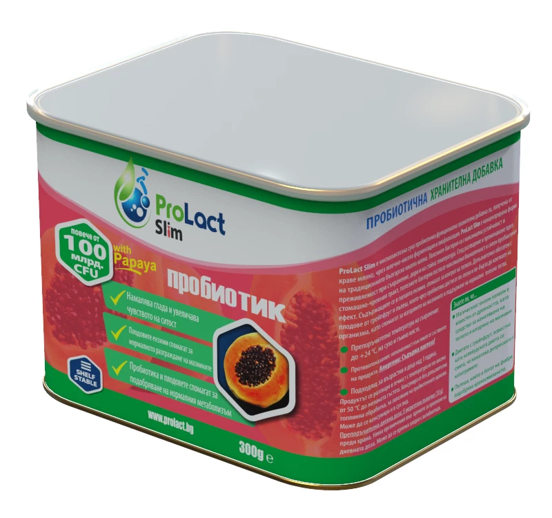 ProLact Slim е нисколактозна суха пробиотична функционална хранителна добавка за нормален метаболизъм, намляване на глада и увеличаване на чувството на ситост, получена от краве мляко, чрез млечно-кисела ферментация и лиофилизация. ProLact Slim е концентрирана форма на традиционното българско кисело мляко. Полезните бактерии са с максимална устойчивост и преживяемост при съхранение, дори и на стайна температура. След разтваряне и преминаване през стомашно-чревния тракт, полезните бактерии постигат максимална бионаличност и силен пробиотичен ефект. Съдържащите се в папаятa ензими, спомагат за контрол на теглото. Допълнително обогатен с лиофилизирани плодове от грейпфрут и пъпеш, които в комбинация с пробиотика достигат по-лесно и по-бързо до клетките на организма, като допълнително спомагат за изгарянето на мазнините и поддържане на нормално телесно тегло.