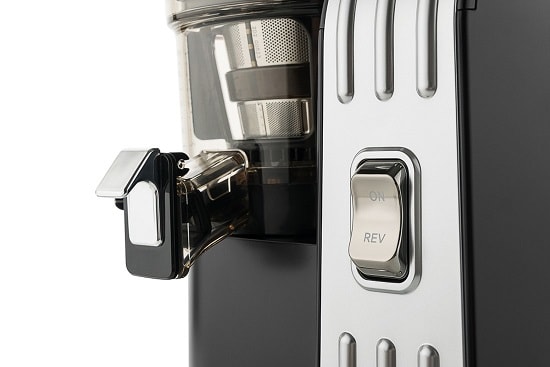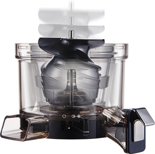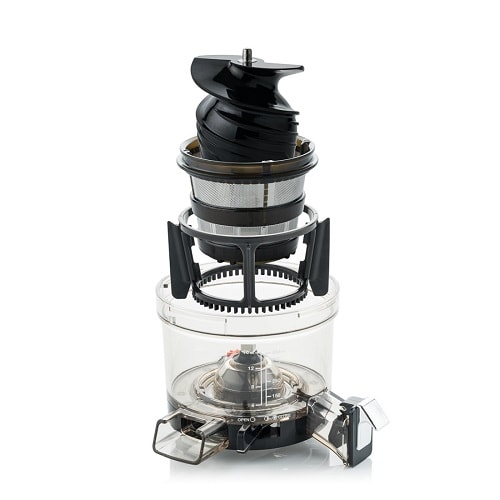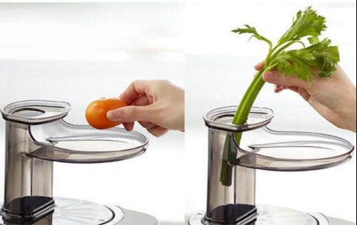 Новият двукомпонентен бункер е проектиран за по-голямо улеснение. Отворът в най-горната част е подходящ за повечето продукти като моркови, целина, ябълки и др. Широкият страничен отвор има прилежаща тава, която е удобна за поставяне на зеленолистни зеленчуци, грозде, горски плодове и нарязани зеленчуци. С двойните магнитни сензори за безопасност, бункерът може да бъде монтиран за работа с дясната или лявата ръка.