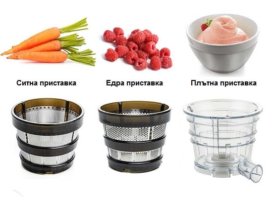 – стандартна ситна цедка от неръждаема стомана за плътен сок без парченца от плода в соковете, за сладък и хранителен изключително гладък сок;