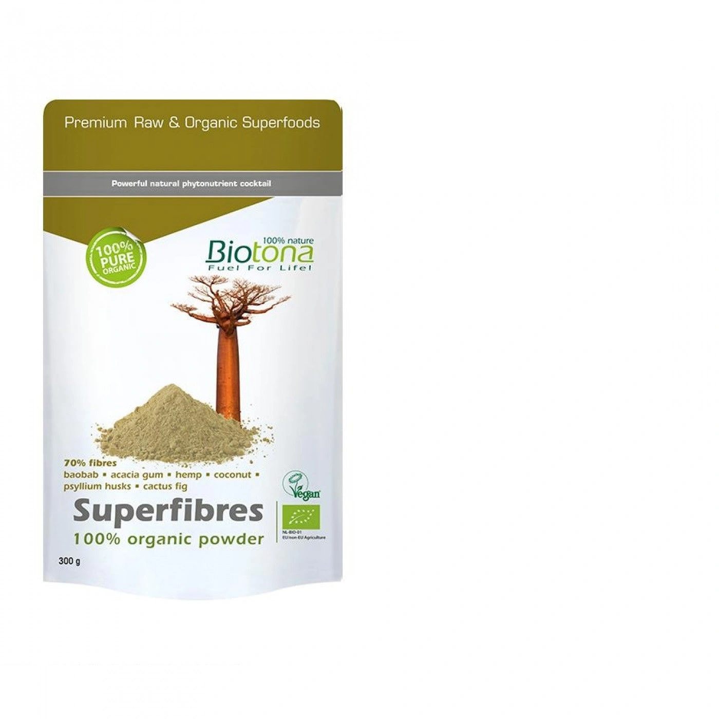 Съществуват 2 основни вида фибри – разтворими и неразтворими. Разтворимите допринасят за подобряване функциите на червата и осигуряват чувство за ситост. Неразтворимите регулират перисталтиката. Главната съставка на продукта са изцяло натурални диетични фибри, добити от Гума Арабика (Accacia senegal tree), 90% от които са разтворими под формата на арабиногалактан (полизахарид). Той е изключителен имуностимулатор и поддържа нормалната чревна миклофлора. Биотона Био Супер Фибри съдържа още неразтворими фибри от кокосово брашно, конопени семена и листа от кактусова смокиня. Сушените плодове от Африкански Баобаб, които също са важна активна съставка в продукта, са богати на разтворими и неразтворими фибри, витамини, минерали и други фитонутриенти. Биотона Био Супер Фибри съдържа и Псилиум – индийски живовляк. Той също е богат на фибри. Много полезни са при запек, синдром на раздразненото черво и диария.