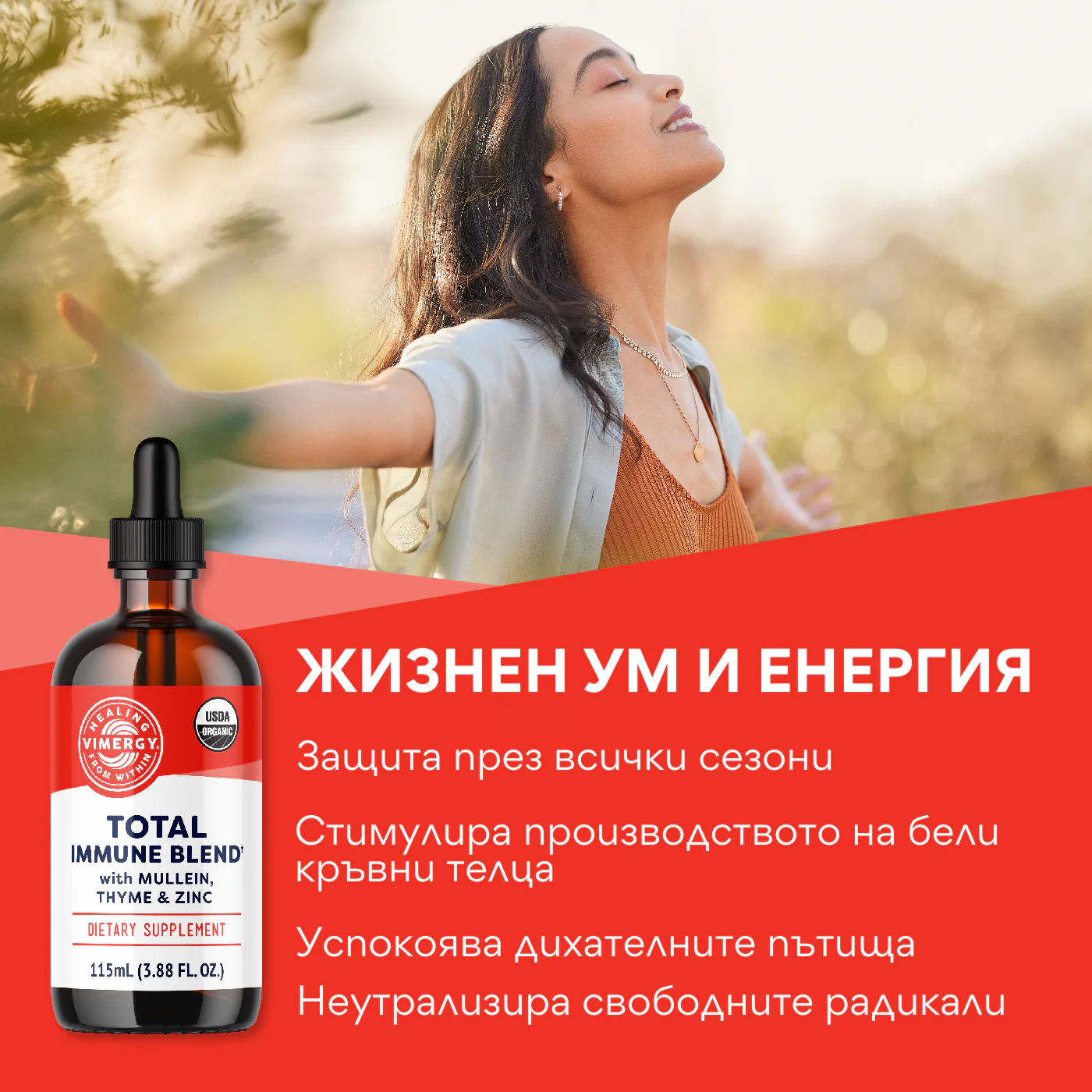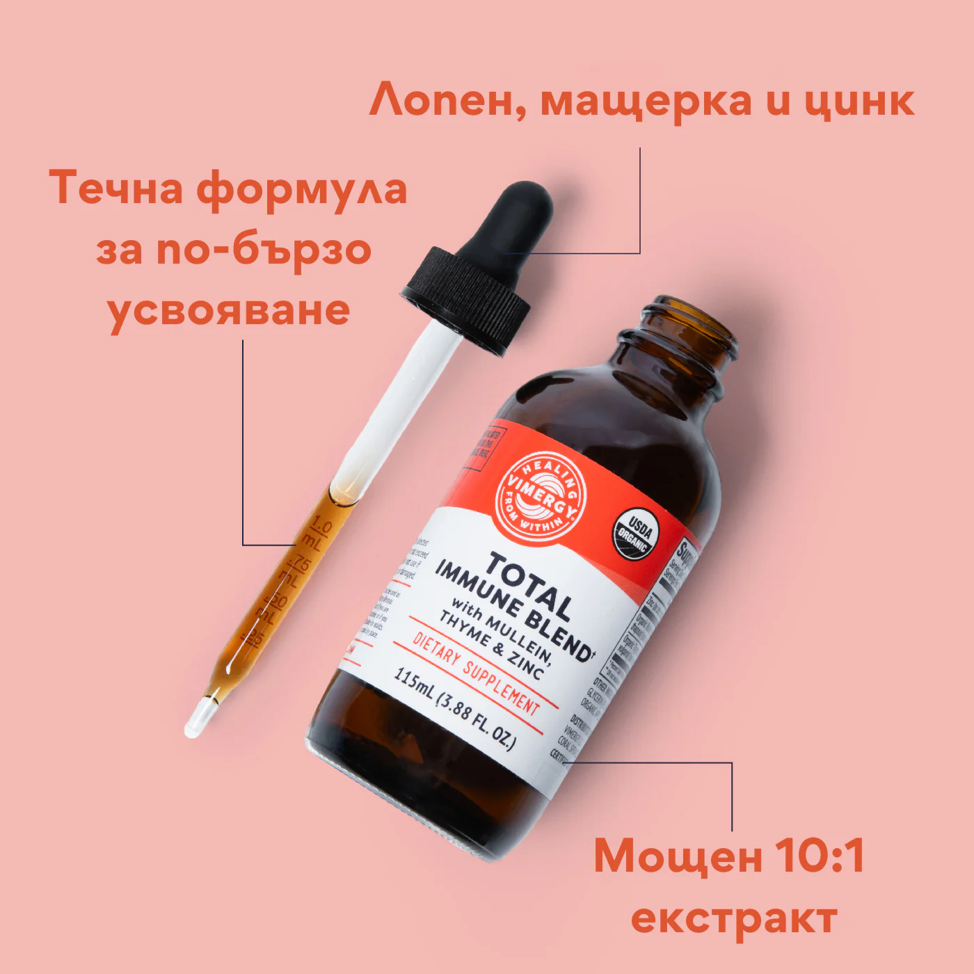 Total Immune Blend™ на Vimergy® е хранителна добавка, която съчетава течен цинк с мащерка и лопен за подсилване на имунитета, осигурява антиоксидантна защита и успокоява деликатните дихателни тъкани.
