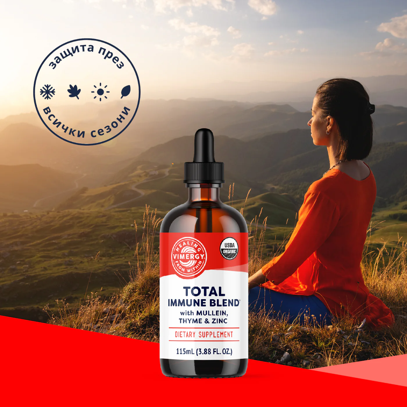 Имунитета е важен през всички сезони. Total Immune Blend™ на Vimergy® осигурява динамична имунна защита през цялата година, а не само през зимните месеци! Съдържа течен цинков сулфат – форма, за която клиничните изследвания са доказали, че е 2 пъти по-биоусвоима в сравнение със стандартните таблетки цинков сулфат.