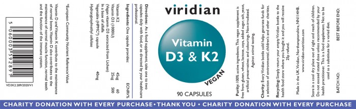 Витамин Д3 и К2 е балансирана комбинация от 2 важни витамина, които подпомагат здравето на костите, сърцето и имунната система. Витамин К действа синергично с витамин Д и са във форма, която се усвоява оптимално от организма – комбинацията допринася за поддържането на състоянието на костите, а витамин Д освен това допринася за нормалното функциониране на мускулите, състоянието на зъбите и функционирането на имунната система. Формулата съдържа 1000IU витамин D3 от веган източник. Тази усъвършенствана форма на витамин Д е от растителен източник (лишеи) и е тествана клинично в Университета на Съри, Великобритания. Витамин К2, който не е тестван върху животни, се получава естествено от ферментирали натто култури. Повече информация за тази хранителна добавка може да видите ТУК.